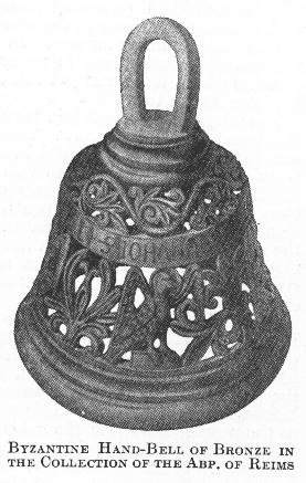 The word clocca (Fr. cloche; Ger. Glocke; Eng. clock) is interesting because in this case it is definitely known what was meant by it. It was certainly Irish in origin and it occurs at an early date both in Latin and in the Irish form clog. Thus it is found in Book of Armagh and is used by Adamnan in his life of St. Columbkill written c. 685. The Irish and English missionaries no doubt imported it into Germany where it appears more than once in the Sacramentary of Gellone. It is plain that in primitive Celtic lands an extraordinary importance was attached to bells. A very large number of these ancient bells, more than sixty in all the immense majority being Irish are still in existence. Many of them are reputed to have belonged to Irish saints and partake of the character of relics. The most famous is that of St. Patrick, the clog-an-edachta, or "bell-off-the-will" now preserved in the Museum of the Royal Irish Academy, Dublin. There seems no serious reason to doubt that this was taken from the tomb in the year 552. Like most of these bells, it had an official and hereditary custodian (in this case named Mulholland) in whose possession it remained, being handed down for centuries from father to son. Other similar early bells are those of St. Senan (c. 540) and St. Mura; there are several in Scotland and Wales, one at St. Gall in Switzerland, one known as the Saufang at Cologne, and another at Noyon in France. The evidence for the extraordinary veneration with which these bells were regarded in Celtic lands is overwhelming. Even Giraldus Cambrensis notes in the twelfth century that upon them was taken the most solemn form of oath. They were also carried into battle, and even though the earlier specimens are nothing but rude cow-bells, wedge-shape in form and made of iron plate bent and roughly riveted, still they were often enclosed at a later daye in cases or "shrines" of the richest workmanship. The shrine of St. Patrick's bell bears an inscription of some length from which we learn that this beautiful specimen of the jeweler's craft must have been wrought about 1005. History tends to repeat itself, and if we remember the important part played in the missionary work of St. Francis Xavier by the handbell with which he gathered round him the children, the idle, or the curious, we have probably a clue to the intimate association of these very early Celtic bells with the work of Christianity. When in 1683 Father Maunoir, the great Breton missionary, had at last to relinquish further expeditions, the bell which he handed on to his successor was regarded as a sort of investiture. It may be noted that the famous round towers of Ireland, which are now generally recognized to have been places of refuge against the inroads of the Danes and other marauders were commonly called cloc teach. The bells occasionally stored there for the sake of safety seem to have been regarded as the most precious of their treasures and from this circumstance the towers probably derived their name, though it is of course possible that they in some cases served as belfries in the more ordinary sense.