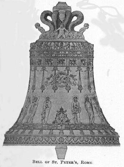 For the credit of eighteenth century scholarship, it seems desirable to explain that only the latter part of this inscription belongs to the pontificate of Pius VI. The earlier portion with its metrical irregularities is simply a copy of what was read upon the great bell of St. Peter's at the beginning of the fourteenth century. Probably the metal came from the bell originally cast by Leo IV in 850, or even earlier under Pope Stephen II. Then, when the campanile was burned down in 1303, Boniface VIII had a new bell made with the inscription which stands first in the above series. Only fifty years afterwards the tower was struck by lightning, and a new great bell was founded (colatur, cf. the French couler) in September 1353. Then Benedict XIV had the ball recast in larger size in 1747, and when this cracked (rimis actis), the metal was once more used by Aloysius Valader to make the present beautiful bell under Pius VI in 1785. (See Cancellieri, De Secrateriis, Rome, 1786, III, 1357, and IV, 1995 sqq,)