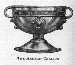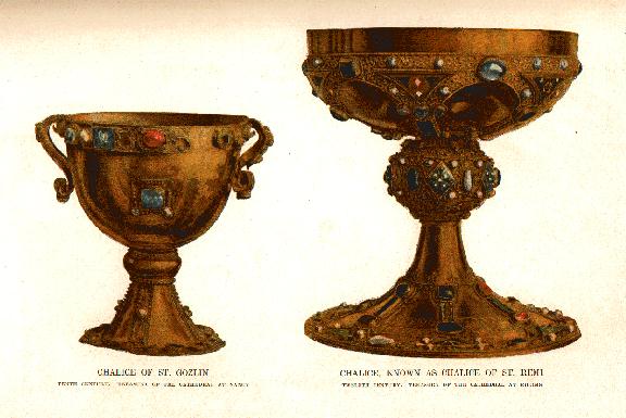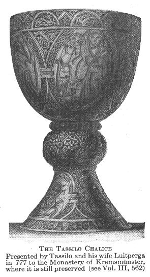 Of chalices earlier than the time of Charlemagne the existing specimens are so few and so doubtful that generalization of any kind is almost impossible. Besides the already mentioned chalice of Chelles, now destroyed, only two of those still preserved can be referred confidently to a date earlier than the year 800. The most remarkable of these is that of Tassilo, which bears the inscription TASSILO DUX FORTIS + LUITPIRG VIRGA (sic) REGALIS. This beautiful piece of metal work exhibits an egg-shaped cup joined to a small conical base by a knop. The character of the ornamentation shows clearly the predominance of Irish influences, even if it be not actually the work of an Irish craftsman. Plainer in design, but very similar in form, is the chalice said to have belonged to St. Ledger. Its Eucharistic character is proved beyond doubt by the inscription which it bears: HIC CALIX SANGVINIS DNI IHV XTI. If, as is possible, these words are intended to form a chronogram, they yield the date 788. Of the succeeding period, by far the most remarkable example preserved is the magnificent relic of Irish art known as the Chalice of Ardagh (see picture), from the place near which it was accidentally discovered in 1868. This is a "ministerial" chalice and it has two handles. It is seven inches in height but as much as nine and a half inches in diameter, and the bowl is capable of containing nearly three pints of liquid. The material is silver alloyed with copper, but gold and other metals have been used in its wonderful ornamentation, consisting largely of interlacing patterns and rich enamels. An inscription in very interesting ancient characters gives simply the names of the Twelve Apostles, a list of course highly suggestive of the Last Supper. The date conjecturally assigned to this masterpiece from the letters of the inscription is the ninth or tenth century. But in any case the broadening of the cup and the firm and wide base indicate a development which is noticeable in nearly all the chalices of the Romanesque period. The chalice known as that of St. Gozlin, Bishop of Toul (922-962), is still preserved in the cathedral of Nancy. In its broad, low, circular form it much resembles the last-named chalice. Another very beautiful ministerial chalice with handles, but of later date (twelfth century?), is that of the Abbey of Wilten in the Tyrol. It may be added that although these double-handled cups of precious metal were no doubt primarily intended for the Communion of the people, they were also on great occasions used by the celebrant in the Holy Sacrifice. The fresco in the under-church of San Clemente in Rome (eleventh century?), representing the Mass of St. Clement, shows a two-handled chalice upon the altar, and the same may be seen in the famous liturgical ivory panel of the Spitza collection (Kraus, Christliche Kunst, II, 18)